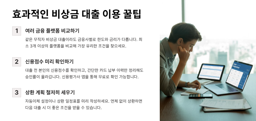 장점은 뭐니 뭐니 해도 접근성이에요. 복잡한 서류 제출 없이, 단 몇 단계만 거치면 대출이 가능해요. 또, 자정 이후나 주말에도 신청과 입금이 가능해 ‘진짜 비상금’ 역할을 해줘요. 하지만 단점도 명확해요. 금리가 일반 대출보다 높고, 상환 기간이 짧은 경우가 많아요. 일부 대출은 1~3개월 내 전액 상환 조건이라 부담이 될 수 있어요. 그래서 무직자비상금대출은 꼭 ‘비상용’으로만 사용하는 것이 좋아요. 반복 사용하면 신용도에 악영향을 줄 수 있기 때문에 계획적인 사용이 중요해요.