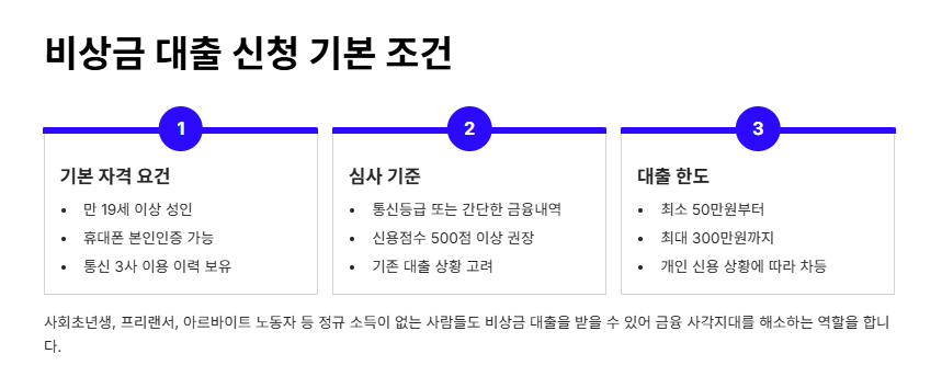 무직자비상금대출의 가장 큰 특징은 정규직 소득이 없어도 된다는 점이에요. 일반적으로 만 19세 이상이며, 휴대폰 본인인증과 통신 3사 이용 이력이 있으면 신청이 가능해요. 또, 일부 상품은 통신등급 또는 간단한 금융내역만으로 심사해요. 금융권마다 조금씩 다르지만, 최대 300만 원까지 소액 대출이 가능하더라고요. 신용점수 500점 이상이면 가능성이 높고, 사회초년생이나 프리랜서에게도 문이 열려 있어요. 무직자비상금대출은 기존 금융 시스템의 사각지대를 채워주는 역할을 하는 것 같아요.