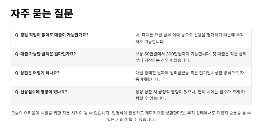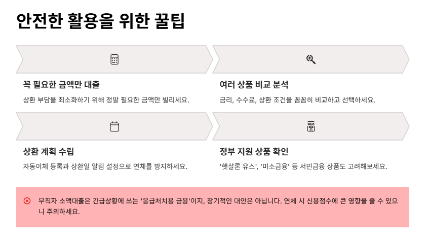 무직자 소액대출은 우리가 예상하지 못한 순간에 꼭 필요한 숨구멍이 되어줄 수 있어요. 중요한 건 ‘지혜롭게 쓰는 것’이에요. 무리하지 않고, 계획적으로 잘 갚는다면 신용도 회복하고 생활도 안정시킬 수 있어요.