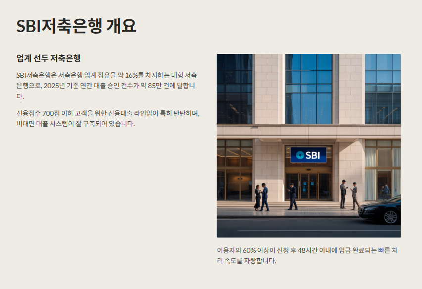 SBI저축은행은 저축은행 중에서도 가장 큰 규모를 자랑해요. 전체 저축은행 업계 점유율 약 16%를 차지하고 있고, 2025년 기준 연간 대출 승인 건수는 약 85만 건에 달해요. 특히 신용점수가 700점 이하인 고객을 위한 신용대출 라인업이 탄탄한 편이에요. 비대면 대출 시스템이 잘 되어 있어서 모바일로 신청하면 상담부터 승인까지 빠르게 진행된다는 장점이 있어요. 실제 이용자의 60% 이상이 48시간 이내에 입금까지 완료된다고 해요.
