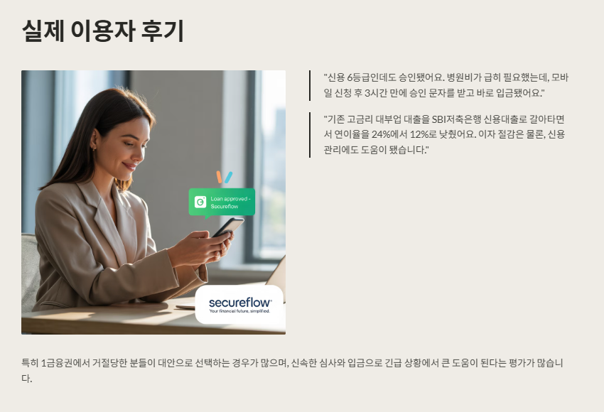 “신용 6등급인데도 승인됐어요”라는 후기가 많아요. 특히 기존 1금융권 대출에서 거절당한 분들이 많이 이용해요. 실제 한 이용자는 병원비가 급히 필요했는데, 모바일 신청 후 3시간 만에 승인 문자를 받고 바로 입금됐다고 해요. 또 다른 사용자는 기존 고금리 대부업 대출을 SBI저축은행 신용대출로 갈아타면서 연이율을 24%에서 12%로 낮췄다고 해요. 실질적인 이자 절감 효과는 물론, 신용관리에도 긍정적인 영향을 줬다는 후기들도 있어요.