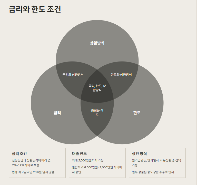 금리는 신용등급과 상환능력에 따라 달라져요. 평균적으로 SBI저축은행 신용대출은 연 7%19% 사이 금리가 책정되며, 금리 상한선은 법정 최고금리인 20%를 넘지 않아요. 대출 한도는 최대 5,000만원까지 가능하지만, 보통은 신용도와 소득에 따라 300만원2,000만원 사이로 승인되는 경우가 많아요. 상환 방식은 원리금균등, 만기일시, 자유상환 중 선택할 수 있어서 본인 상황에 맞게 조절이 가능해요. 중도상환 수수료는 일부 상품에서 면제돼요.